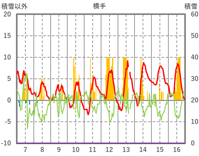 | 日 | 時 | 気温 | 降水 | 風向/風速 | 日照 | 積雪 | 降雪 |