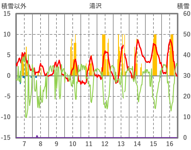 | 日 | 時 | 気温 | 降水 | 風向/風速 | 日照 | 積雪 | 降雪 |