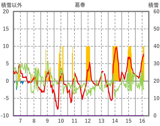 | 日 | 時 | 気温 | 降水 | 風向/風速 | 日照 | 積雪 | 降雪 |