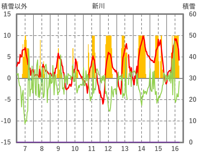 | 日 | 時 | 気温 | 降水 | 風向/風速 | 日照 | 積雪 | 降雪 |