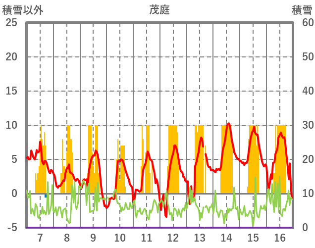 | 日 | 時 | 気温 | 降水 | 風向/風速 | 日照 | 積雪 | 降雪 |