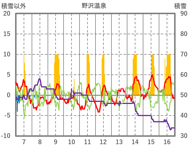 | 日 | 時 | 気温 | 降水 | 風向/風速 | 日照 | 積雪 | 降雪 |