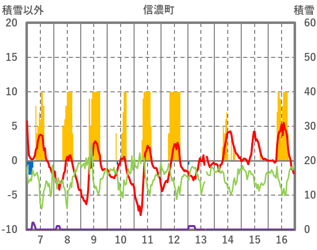 | 日 | 時 | 気温 | 降水 | 風向/風速 | 日照 | 積雪 | 降雪 |
