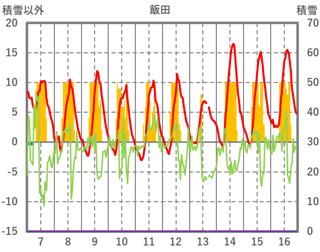 | 日 | 時 | 気温 | 降水 | 風向/風速 | 日照 | 積雪 | 降雪 |