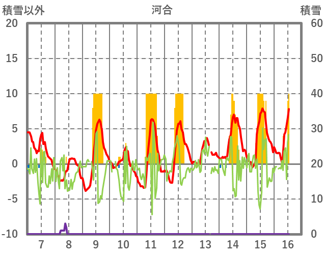 | 日 | 時 | 気温 | 降水 | 風向/風速 | 日照 | 積雪 | 降雪 |