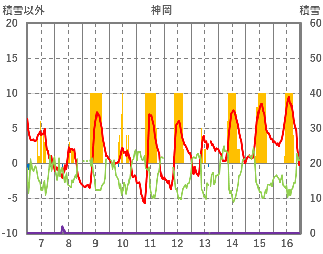 | 日 | 時 | 気温 | 降水 | 風向/風速 | 日照 | 積雪 | 降雪 |