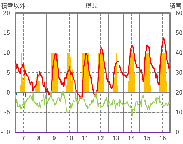 | 日 | 時 | 気温 | 降水 | 風向/風速 | 日照 | 積雪 | 降雪 |