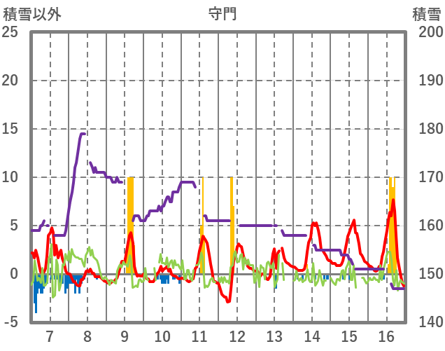 | 日 | 時 | 気温 | 降水 | 風向/風速 | 日照 | 積雪 | 降雪 |