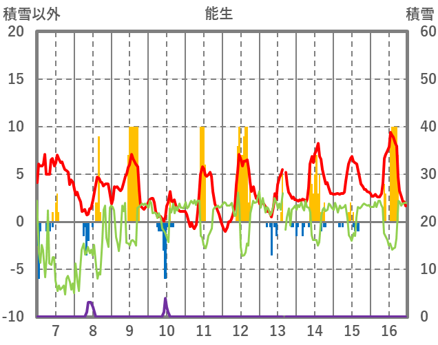 | 日 | 時 | 気温 | 降水 | 風向/風速 | 日照 | 積雪 | 降雪 |