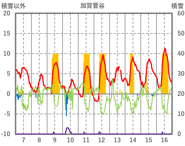 | 日 | 時 | 気温 | 降水 | 風向/風速 | 日照 | 積雪 | 降雪 |