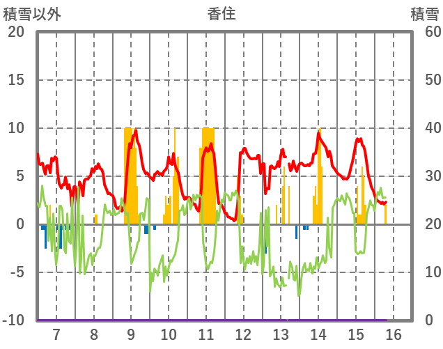 | 日 | 時 | 気温 | 降水 | 風向/風速 | 日照 | 積雪 | 降雪 |