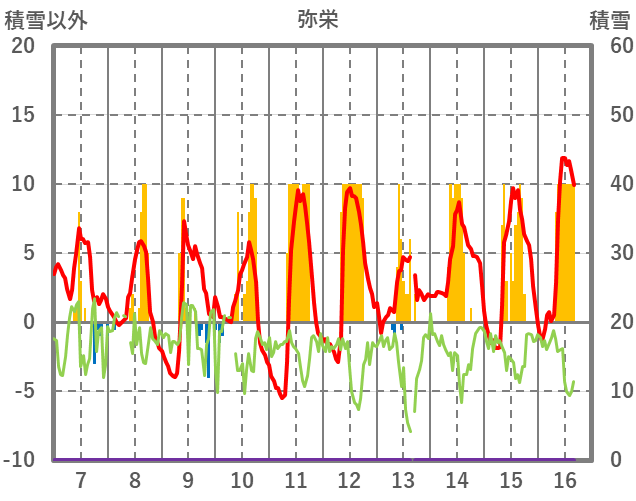 | 日 | 時 | 気温 | 降水 | 風向/風速 | 日照 | 積雪 | 降雪 |