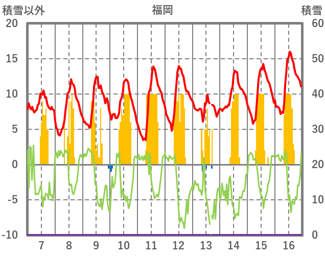 | 日 | 時 | 気温 | 降水 | 風向/風速 | 日照 | 積雪 | 降雪 |