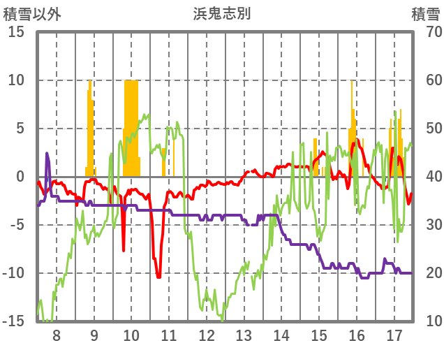 | 日 | 時 | 気温 | 降水 | 風向/風速 | 日照 | 積雪 | 降雪 |