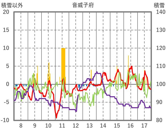 | 日 | 時 | 気温 | 降水 | 風向/風速 | 日照 | 積雪 | 降雪 |