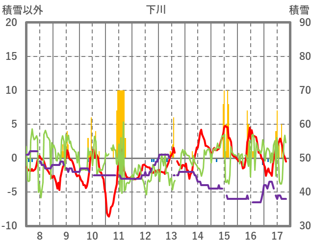 | 日 | 時 | 気温 | 降水 | 風向/風速 | 日照 | 積雪 | 降雪 |
