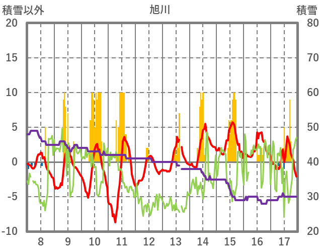 | 日 | 時 | 気温 | 降水 | 風向/風速 | 日照 | 積雪 | 降雪 |