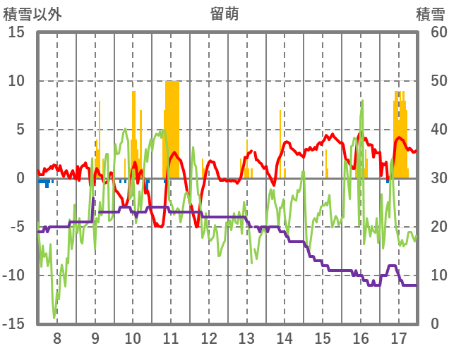 | 日 | 時 | 気温 | 降水 | 風向/風速 | 日照 | 積雪 | 降雪 |