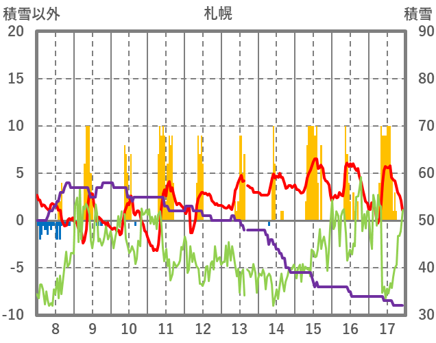 | 日 | 時 | 気温 | 降水 | 風向/風速 | 日照 | 積雪 | 降雪 |