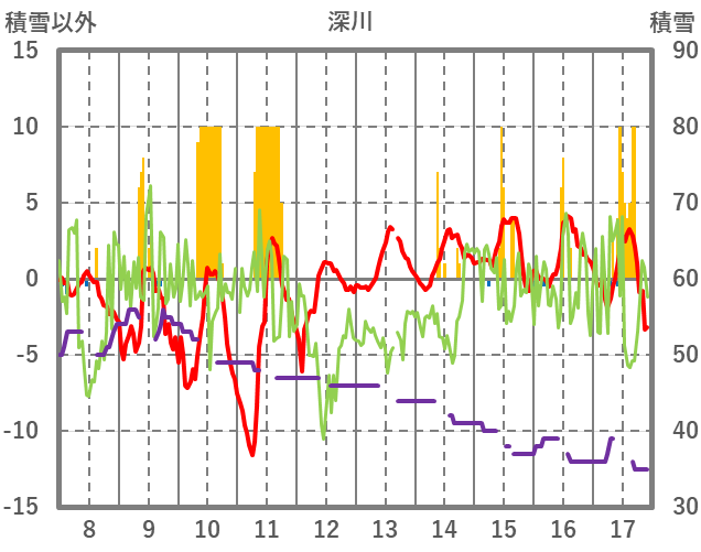| 日 | 時 | 気温 | 降水 | 風向/風速 | 日照 | 積雪 | 降雪 |