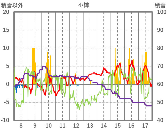 | 日 | 時 | 気温 | 降水 | 風向/風速 | 日照 | 積雪 | 降雪 |
