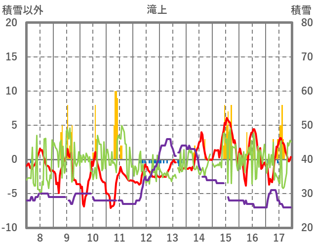 | 日 | 時 | 気温 | 降水 | 風向/風速 | 日照 | 積雪 | 降雪 |