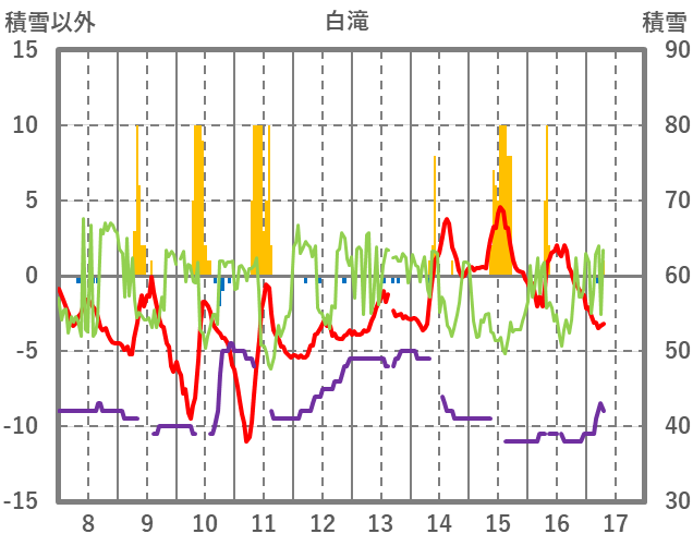 | 日 | 時 | 気温 | 降水 | 風向/風速 | 日照 | 積雪 | 降雪 |