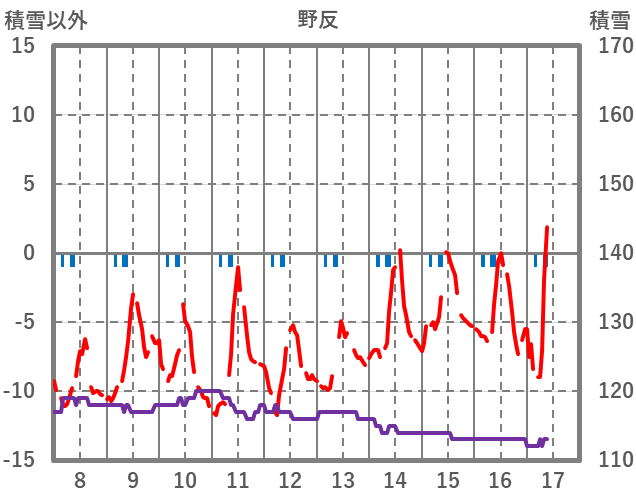 | 日 | 時 | 気温 | 降水 | 風向/風速 | 日照 | 積雪 | 降雪 |