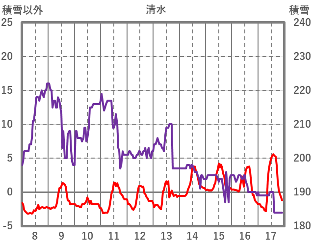 | 日 | 時 | 気温 | 降水 | 風向/風速 | 日照 | 積雪 | 降雪 |