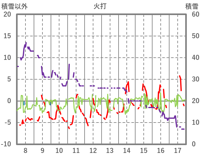 | 日 | 時 | 気温 | 降水 | 風向/風速 | 日照 | 積雪 | 降雪 |