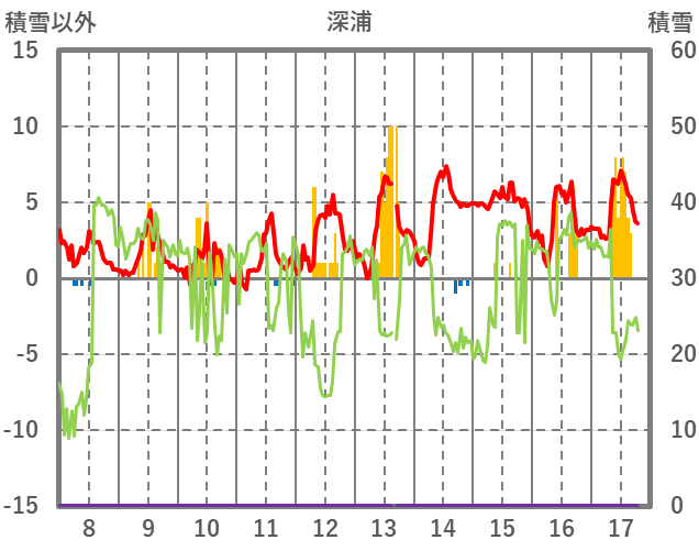 | 日 | 時 | 気温 | 降水 | 風向/風速 | 日照 | 積雪 | 降雪 |