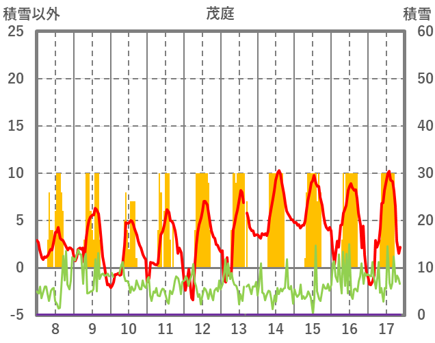 | 日 | 時 | 気温 | 降水 | 風向/風速 | 日照 | 積雪 | 降雪 |