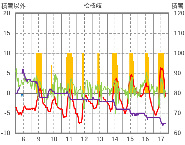 | 日 | 時 | 気温 | 降水 | 風向/風速 | 日照 | 積雪 | 降雪 |