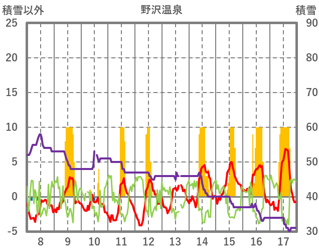 | 日 | 時 | 気温 | 降水 | 風向/風速 | 日照 | 積雪 | 降雪 |