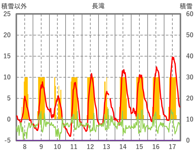 | 日 | 時 | 気温 | 降水 | 風向/風速 | 日照 | 積雪 | 降雪 |