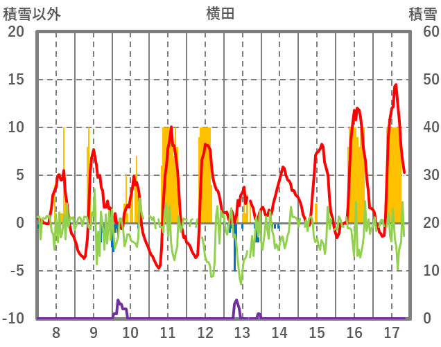 | 日 | 時 | 気温 | 降水 | 風向/風速 | 日照 | 積雪 | 降雪 |
