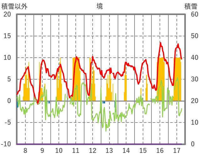 | 日 | 時 | 気温 | 降水 | 風向/風速 | 日照 | 積雪 | 降雪 |