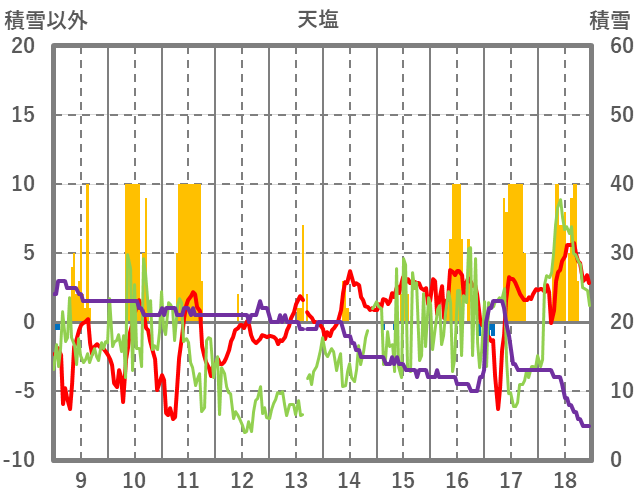 | 日 | 時 | 気温 | 降水 | 風向/風速 | 日照 | 積雪 | 降雪 |