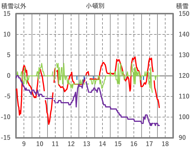| 日 | 時 | 気温 | 降水 | 風向/風速 | 日照 | 積雪 | 降雪 |