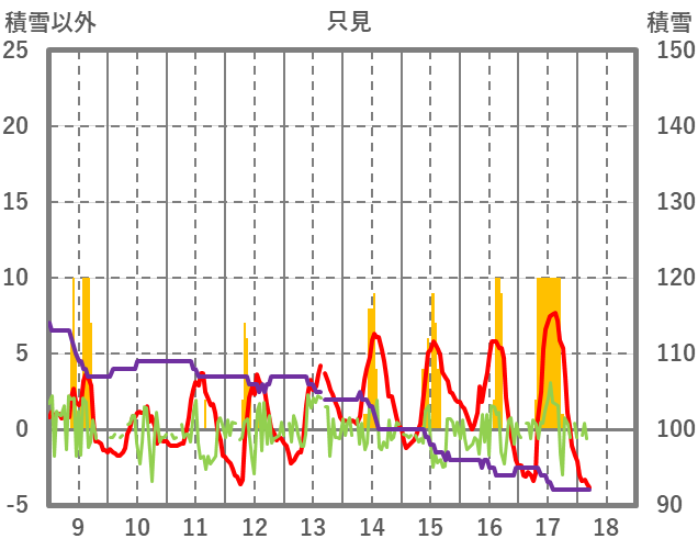 | 日 | 時 | 気温 | 降水 | 風向/風速 | 日照 | 積雪 | 降雪 |