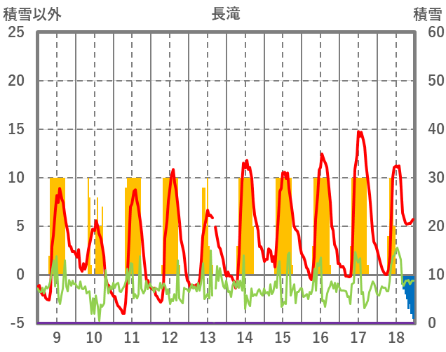| 日 | 時 | 気温 | 降水 | 風向/風速 | 日照 | 積雪 | 降雪 |