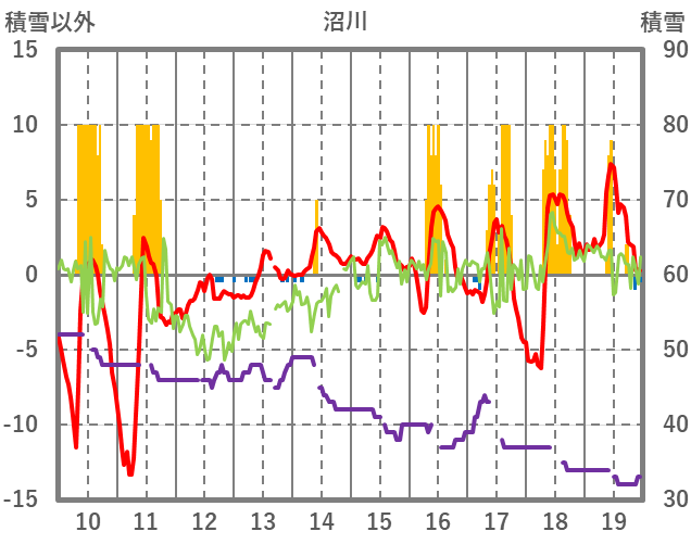 | 日 | 時 | 気温 | 降水 | 風向/風速 | 日照 | 積雪 | 降雪 |