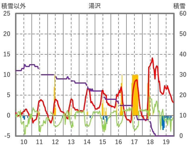 | 日 | 時 | 気温 | 降水 | 風向/風速 | 日照 | 積雪 | 降雪 |