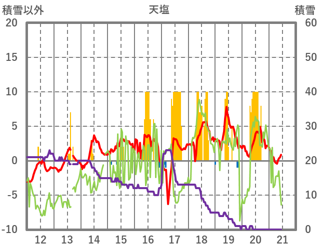 | 日 | 時 | 気温 | 降水 | 風向/風速 | 日照 | 積雪 | 降雪 |