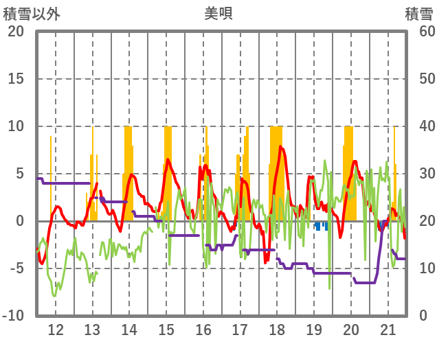 | 日 | 時 | 気温 | 降水 | 風向/風速 | 日照 | 積雪 | 降雪 |