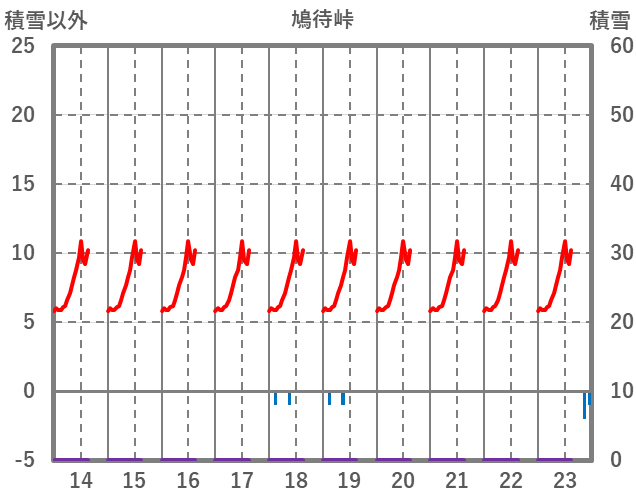 | 日 | 時 | 気温 | 降水 | 風向/風速 | 日照 | 積雪 | 降雪 |