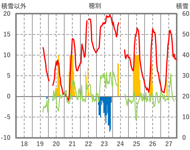 | 日 | 時 | 気温 | 降水 | 風向/風速 | 日照 | 積雪 | 降雪 |