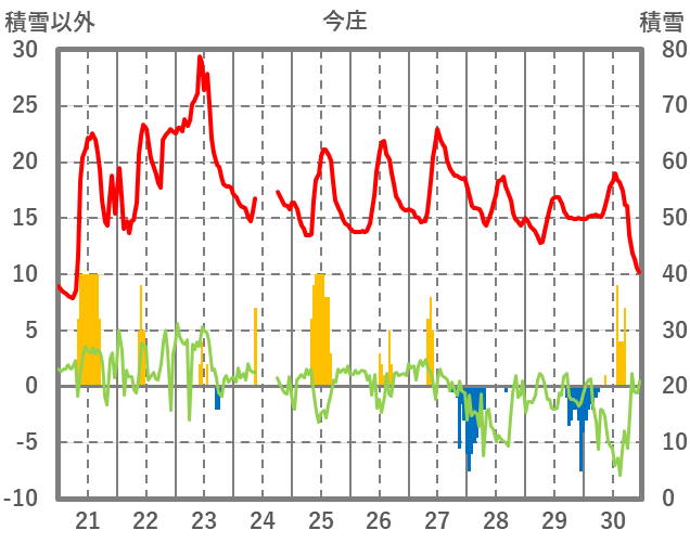 | 日 | 時 | 気温 | 降水 | 風向/風速 | 日照 | 積雪 | 降雪 |