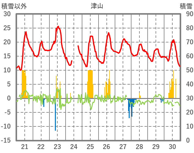| 日 | 時 | 気温 | 降水 | 風向/風速 | 日照 | 積雪 | 降雪 |