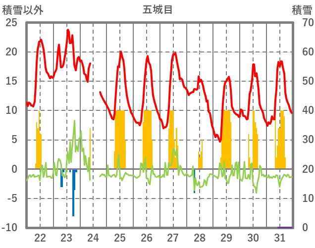 | 日 | 時 | 気温 | 降水 | 風向/風速 | 日照 | 積雪 | 降雪 |